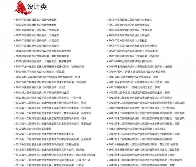 歷次“華耐杯中國(guó)室內(nèi)設(shè)計(jì)大賽”湖南地區(qū)最高獎(jiǎng),2013中國(guó)室內(nèi)設(shè)計(jì)大賽公共空間方案類銀獎(jiǎng)及銅獎(jiǎng)、第十三屆湖南室內(nèi)設(shè)計(jì)大賽公共空間及家居空間實(shí)例類金獎(jiǎng)、銀獎(jiǎng)、銅獎(jiǎng)、優(yōu)秀獎(jiǎng)等,2012中國(guó)室內(nèi)設(shè)計(jì)大賽“中國(guó)最佳設(shè)計(jì)企業(yè)”及商業(yè)空間類金獎(jiǎng)、第九屆中國(guó)室內(nèi)設(shè)計(jì)雙年展公共空間類金獎(jiǎng)及居住空間類金獎(jiǎng)、中國(guó)室內(nèi)設(shè)計(jì)大賽文教、醫(yī)療方案類銀獎(jiǎng)、第十二屆湖南室內(nèi)設(shè)計(jì)大賽設(shè)計(jì)方案公共空間類金獎(jiǎng)、銀獎(jiǎng)及家居空間類金獎(jiǎng)、銀獎(jiǎng)等,2011年IAI AWARD綠色設(shè)計(jì)全球“最佳方案設(shè)計(jì)獎(jiǎng)”、第二屆中國(guó)國(guó)際空間環(huán)境藝術(shù)設(shè)計(jì)大賽筑巢獎(jiǎng)、金外灘室內(nèi)設(shè)計(jì)大賽最佳概念設(shè)計(jì)優(yōu)秀獎(jiǎng),2010年金外灘獎(jiǎng)“最佳創(chuàng)新設(shè)計(jì)獎(jiǎng)”和“最佳概念設(shè)計(jì)獎(jiǎng)”、尚高杯中國(guó)室內(nèi)設(shè)計(jì)大賽金獎(jiǎng)、APIDA(香港)18屆亞太室內(nèi)設(shè)計(jì)大賽三等獎(jiǎng),2009年“中國(guó)室內(nèi)設(shè)計(jì)大賽唯一實(shí)例類金獎(jiǎng)”,2006年“海峽兩岸四地室內(nèi)設(shè)計(jì)銅獎(jiǎng)”、“IFI國(guó)際設(shè)計(jì)大賽銅獎(jiǎng)”、2006年“首屆歐神諾杯設(shè)計(jì)大賽”金、銀獎(jiǎng),包攬2000—2006年六屆“湖南室內(nèi)設(shè)計(jì)大賽”金獎(jiǎng),2003年“意大利歐神諾杯設(shè)計(jì)大賽”銀獎(jiǎng)、“迅達(dá)杯設(shè)計(jì)大賽”金獎(jiǎng),2002年“全國(guó)歐典杯室內(nèi)設(shè)計(jì)大賽”銀獎(jiǎng)、“湖南環(huán)保時(shí)尚設(shè)計(jì)大賽”金獎(jiǎng)。