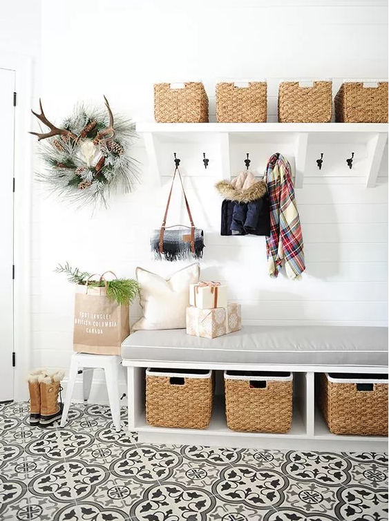 如果家里常住的人數(shù)不多的話,更建議只裝隔板架,其它的比如板凳或掛鉤就不要布置了,直接留白,這樣既可以保持空間的通透,整個(gè)空間的視覺也會(huì)有擴(kuò)充的效果。