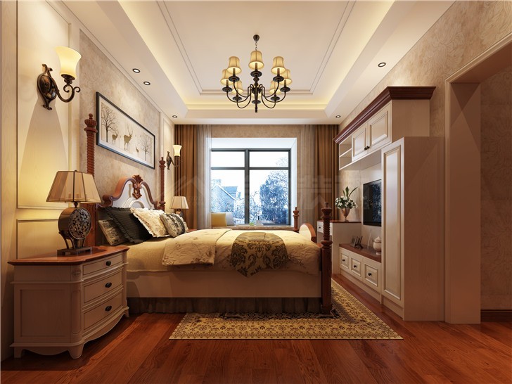 臥室講究私密性,主要以功能性和實用舒適為考慮的重點,多用溫馨柔軟的成套布藝來裝點,同時在軟裝和用色上非常統(tǒng)一。現(xiàn)代美式多用非炫目燈光,且盡量做到只見光不見燈的效果。