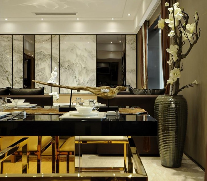 餐廳中金屬元素較多。珊瑚金色溫潤高雅,蘊含的活力帶給人無窮的力量和溫暖,除了高貴以外,更多了一份親近......
