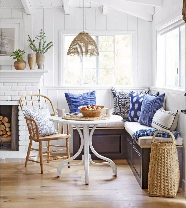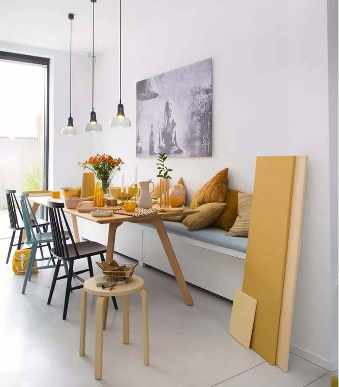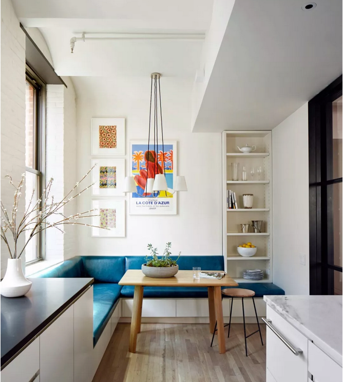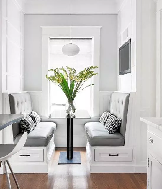 L形的卡座通常設(shè)置在拐角位置,在充分利用角落的同時,也增加了收納空間,同時卡座區(qū)還為家增添了用餐、休閑等功能。