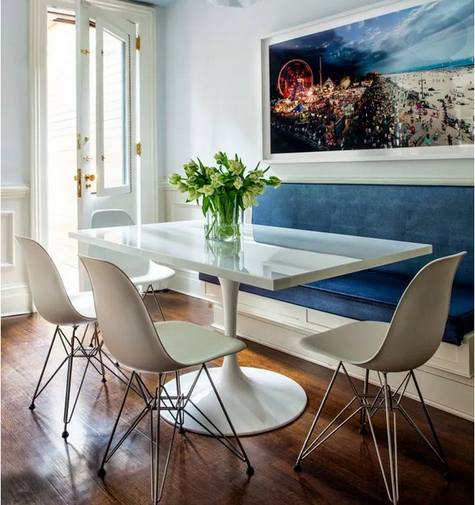 這種卡座依墻而設(shè),是裝修中最為常見的形式,直線型結(jié)構(gòu)既簡單又節(jié)省空間。搭配座椅使用,相對來說比較靈活。所以,適合大部分家庭。