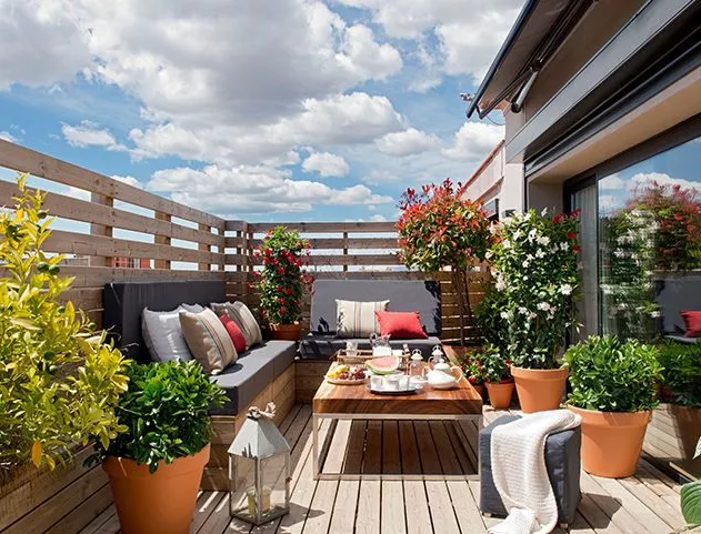 在露臺(tái)上安裝棚架也是不錯(cuò)的選擇,有保護(hù)私密、遮風(fēng)擋雨、為植物提供生長(zhǎng)空間的作用。安裝時(shí)需考慮其抗風(fēng)穩(wěn)固性。