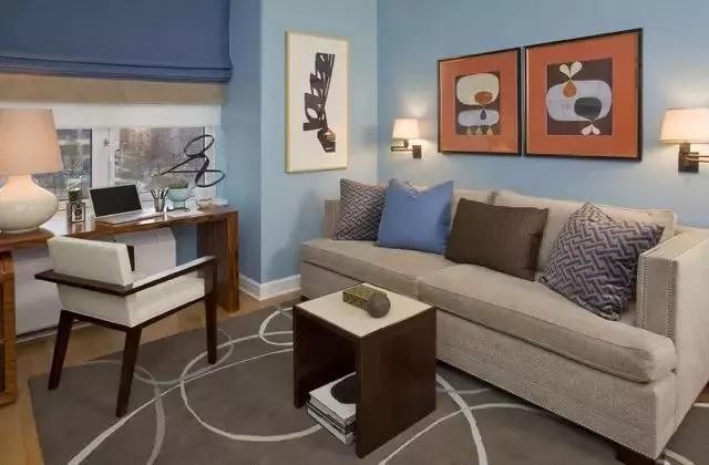 藍(lán)色背景墻+藍(lán)色沙發(fā)營(yíng)造視覺的統(tǒng)一性。