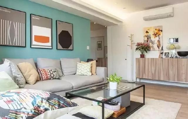 淺藍(lán)背景墻+灰色沙發(fā),經(jīng)典溫馨。
