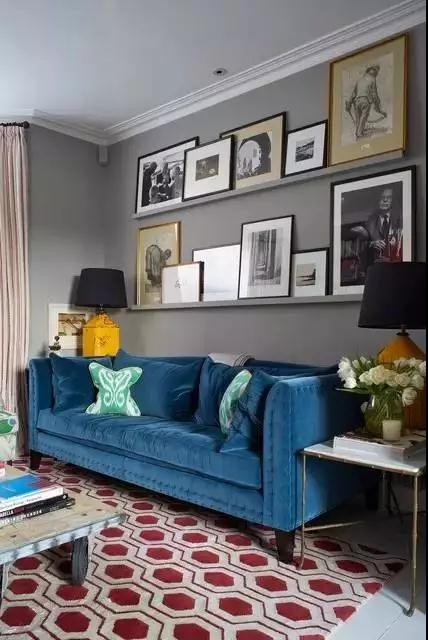 淺藍(lán)背景墻+淺灰色沙發(fā)+照片墻,藝術(shù)氛圍極其凸顯。