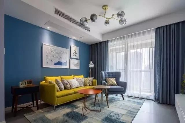 藍(lán)色背景墻+亮黃沙發(fā)讓空間主次分明。
