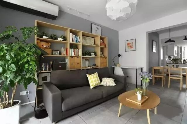 灰色背景墻+木質(zhì)家具+灰色沙發(fā)