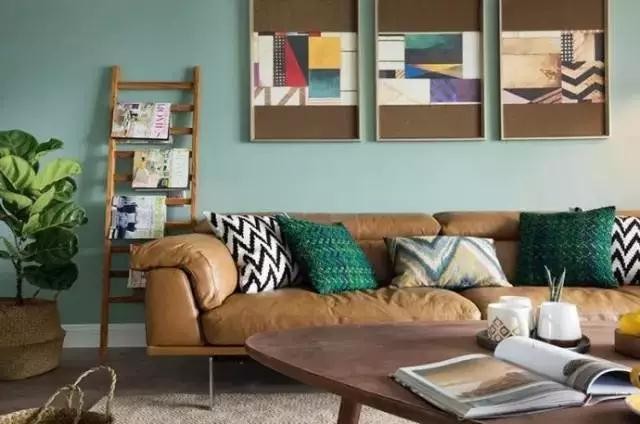 孔雀綠背景墻+褐色沙發(fā)營(yíng)造自然輕松的空間氛圍。