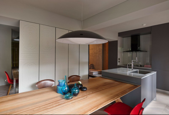 藍(lán)色花瓶、紅色座椅、淺灰色的吊燈也讓家變得跳動(dòng)起來(lái)了。