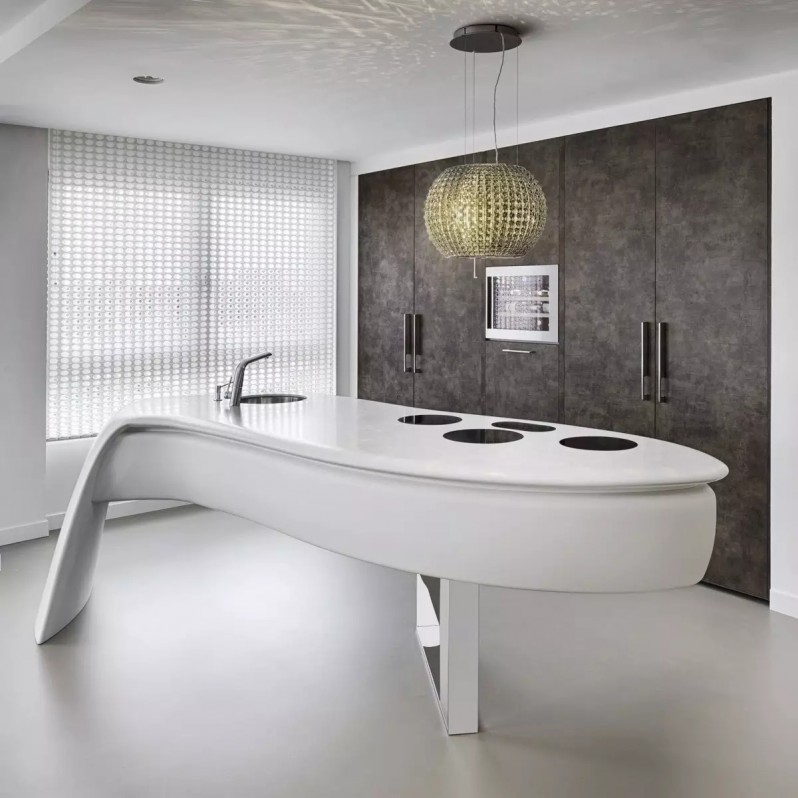 吧臺的不規(guī)則立面,無拉手設(shè)計,線條優(yōu)美,貼合指尖曲線躍動自然。