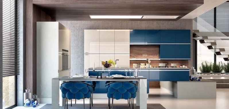 清淺的藍(lán)色和白色構(gòu)置的廚房空間清新十足,空曠的開放式餐廚設(shè)計,空間現(xiàn)代風(fēng)氣質(zhì)十足。