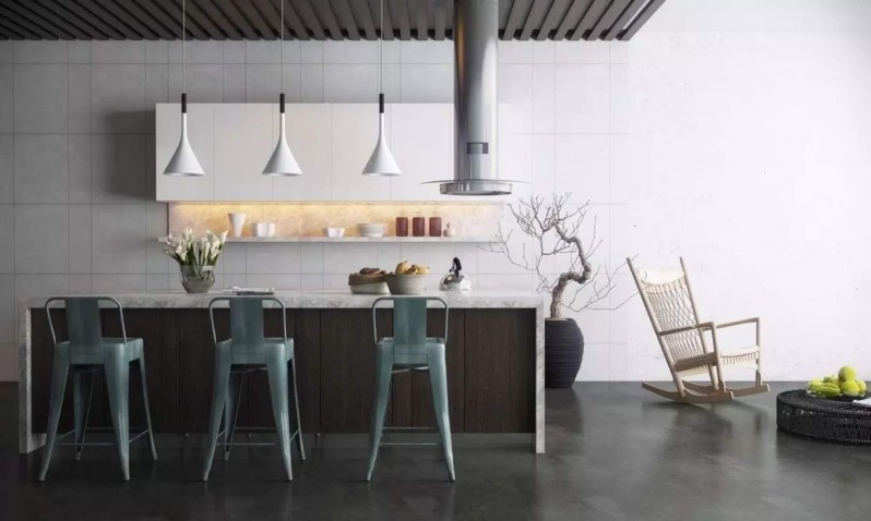 大氣又時尚的廚房,以造型燈飾、復(fù)古吧椅和深灰色櫥柜,塑造質(zhì)感韻味。