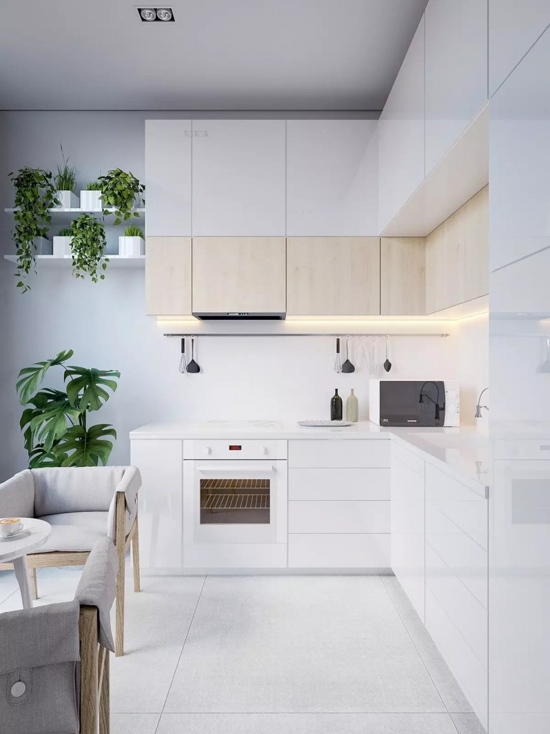 白色還是白色,但是不做裸墻,混搭式的柜體設(shè)計,再配上一小節(jié)的瓷磚,讓廚房更小清新,烹飪者的心情怎么會差呢?