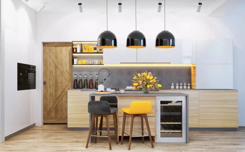 白+原木+黃色櫥柜搭配簡約、時尚風(fēng)格的鏗固門窗,頗有歐式風(fēng)情,整體效果很大氣,再加上造型獨特的吊燈,讓廚房設(shè)計簡約又不失個性。