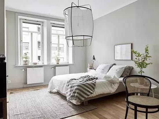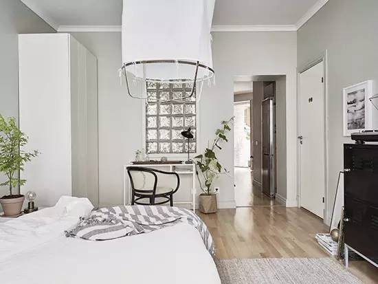 主臥空間沒有門,與客廳是相通的,讓空氣在屋內(nèi)更好地流通。墻面、家具、床品的色彩是最典型最純樸的簡潔北歐風。墻面的小工作臺讓空間功能更加豐富,背景墻使用了與玄關相同的設計。