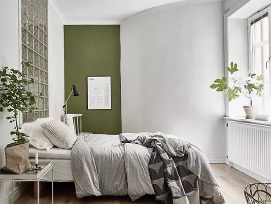 次臥空間不大卻也體現(xiàn)出與整體家居風格的協(xié)調(diào)性。床頭背景墻仍然是馬賽克拼貼,一個小小的設計元素遍及了家中的每個角落。深綠色的墻面趕走了單一色調(diào)的乏味,床頭柜上的一株綠色植物用紙袋做花盆,也是個樸實的生活細節(jié)。