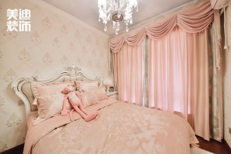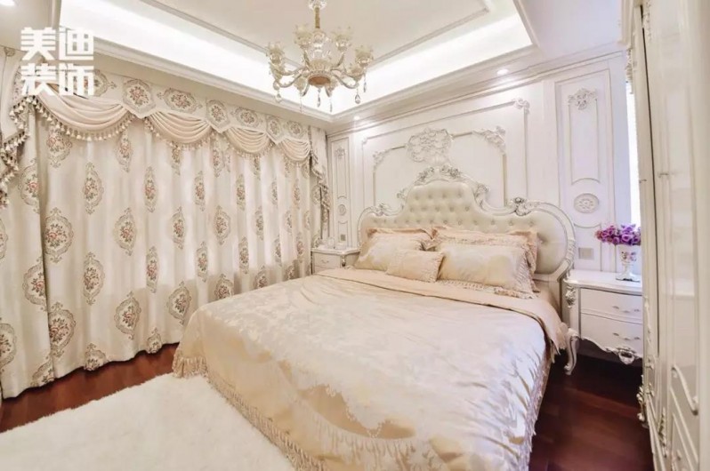 主臥華麗復(fù)古的水晶吊燈、原木地板的溫暖質(zhì)感,所有家具配飾都是在設(shè)計(jì)師的建議下購買的,精致的背景墻設(shè)計(jì),打造出夢幻的感覺。