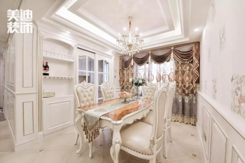 別致的酒柜、精美的吊頂、柔和的燈光、典雅的壁紙,整個(gè)餐廳落落大方,營造出歐式風(fēng)格典雅、浪漫的氣氛。