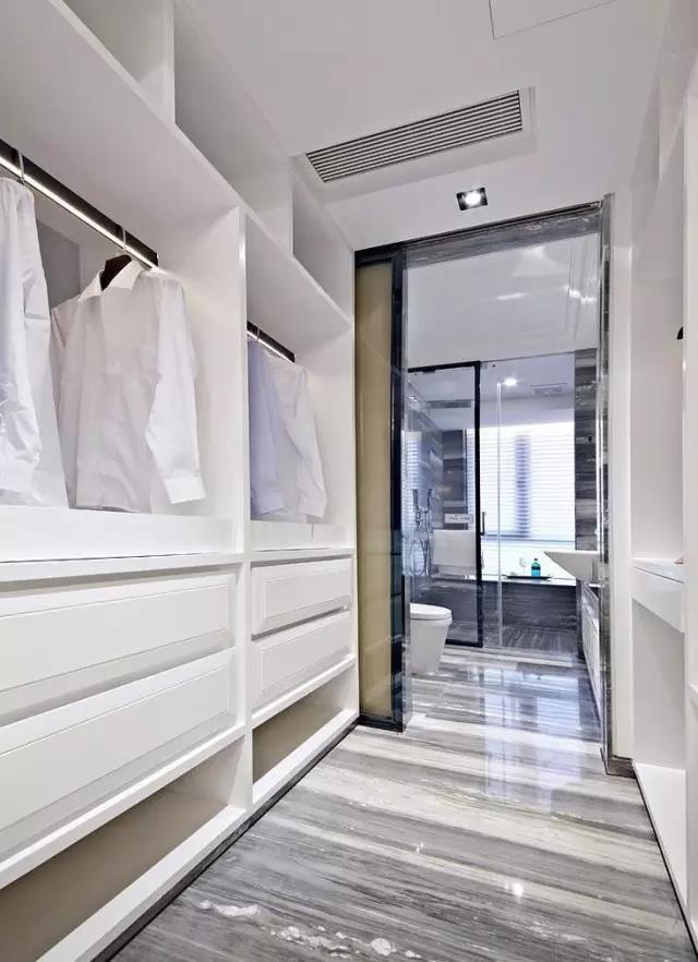 主衛(wèi)的通道,甚至是衛(wèi)生間原本的干區(qū),都可以改造利用起來,把主衛(wèi)門外的兩側(cè)裝成步入式衣帽間,這樣利用也是不錯(cuò)的選擇。