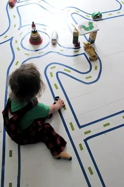 ▲ 黑板墻衣柜門+掛衣桿+地面玩具跑道。