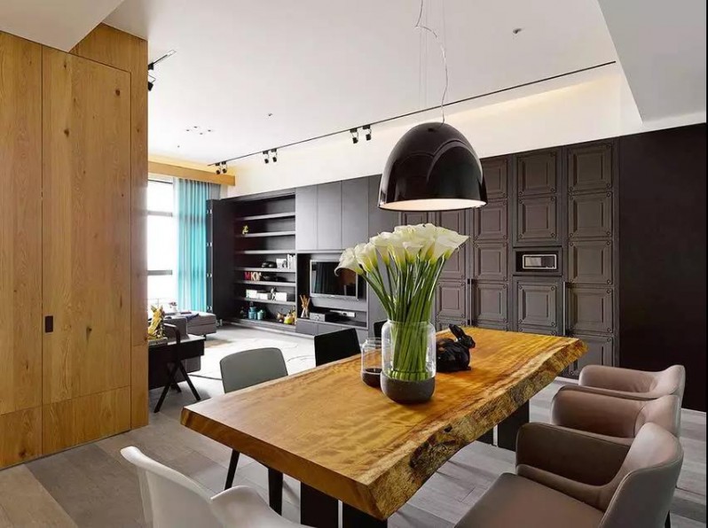 餐廳推開(kāi)大門即是,圓形吊燈第一時(shí)間就鎖定了視線,木質(zhì)面板的餐桌為房子打來(lái)了稀有的厚重感。