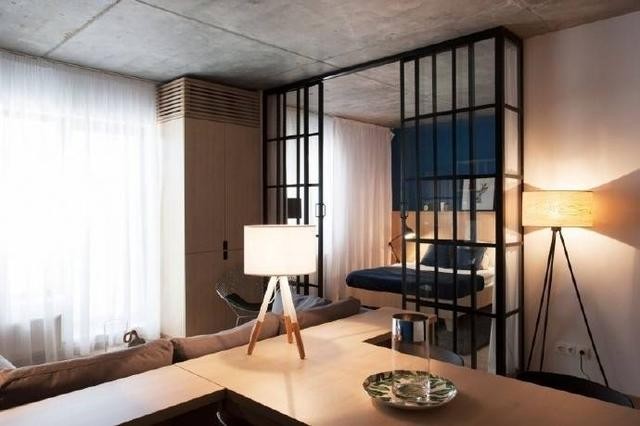 臥室與客廳之間是采用現(xiàn)在超級(jí)流行的黑框隔斷
