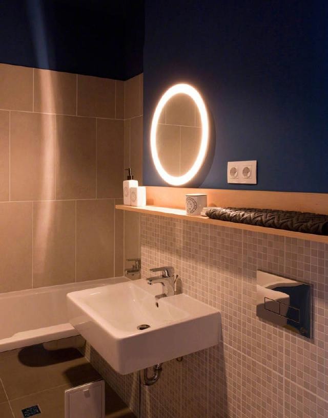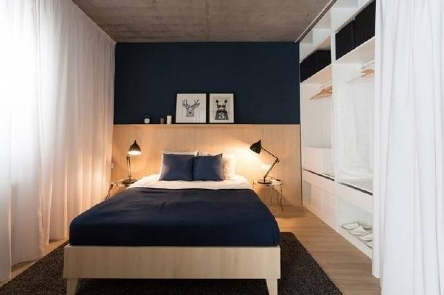 廚房的墻面還是采用大面積的深藍(lán),櫥柜等設(shè)計(jì)都是極簡(jiǎn)