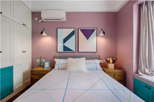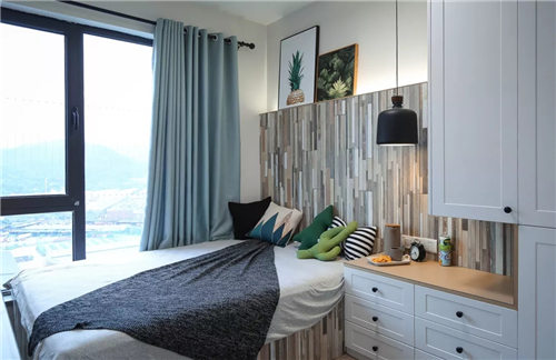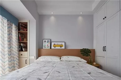 把床靠窗擺放,床頭背景墻以木紋圖案地板打造,床頭的墻突出部分裝成一道擺臺,擺上裝飾畫也是清新又愜意。將衣柜與床頭柜結合,節(jié)省了單獨設計床頭柜的空間。