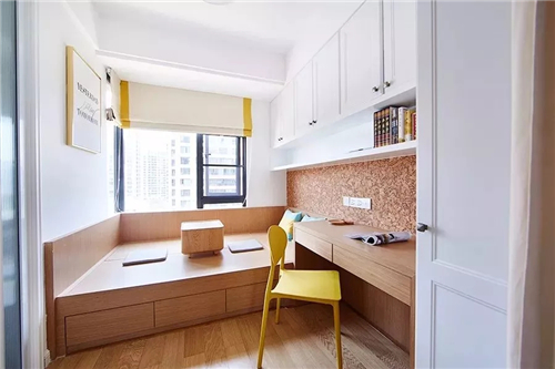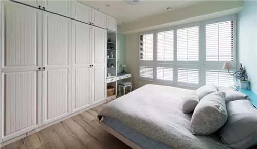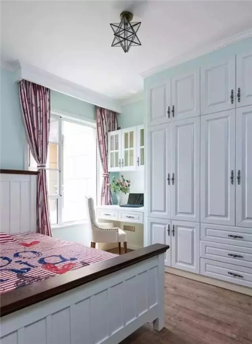 如果說臥室的衣柜只占到了墻面一半,剩余空間你會怎么利用?如果剛剛好又有一個窗戶,這個時候果斷選擇設計一個書桌,大小很合適,采光更加好,豈不是物盡其用。