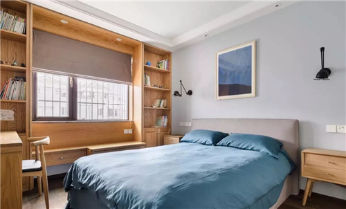 臥室飄窗柜與書柜組合,既能解決藏書問題,而且飄窗下方的收納柜能夠收納生活中的瑣碎雜物,儲物能力杠杠的。