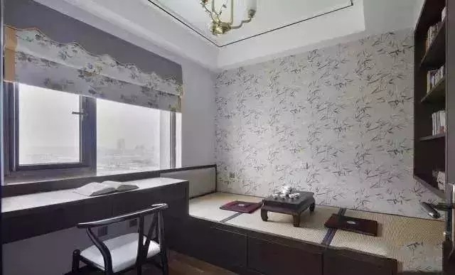 書房、榻榻米休閑空間,私密性低一點(diǎn),所以一般書房可以使用通透百葉簾,如果是書房兼次臥就選擇私密性好一點(diǎn)的布簾。上圖碎花羅馬簾與背景壁紙呼應(yīng)