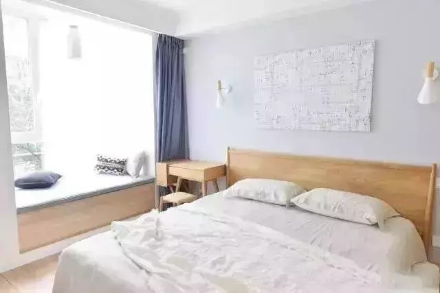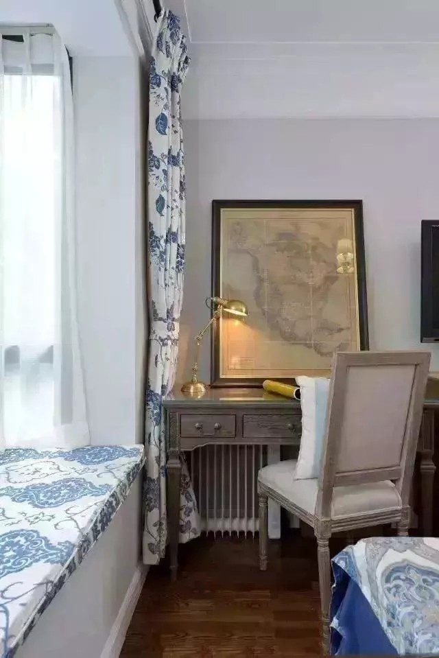 很明顯,上面搭配的窗簾與床品以及飄窗墊都是呼應(yīng)的,很整體,但是提醒各位業(yè)主,太花的布料要慎用,特別是在空間較小的房間,花布的顏色也要有所考究