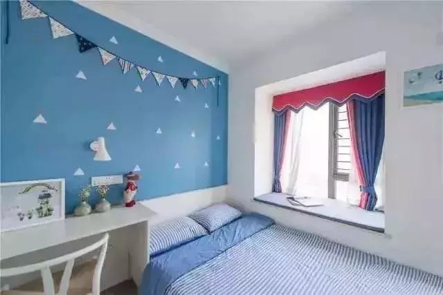 兒童房墻體藍(lán)色壁紙,床品也是淡藍(lán)色條紋,搭配白色的家具,窗簾用藍(lán)色呼應(yīng),局部紅色跳躍設(shè)計(jì),打破沉悶,也顯得活潑明亮
