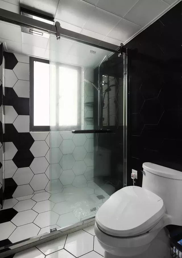 ▲衛(wèi)生間采用黑板搭,白色帶來(lái)清爽,黑色顯穩(wěn)重,玻璃門(mén)和防水臺(tái)把干濕分離做得很到位。