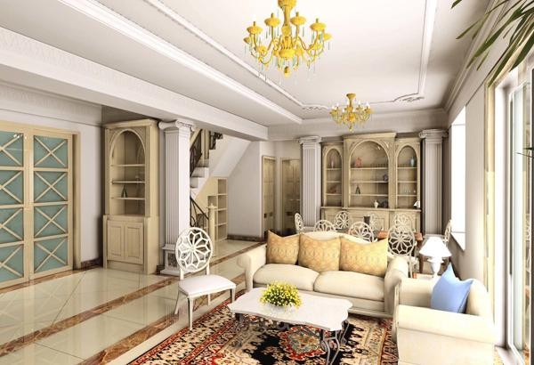 客廳是主人經(jīng)常會(huì)客的地方??蛷d的顏色要充分體現(xiàn)主人的特點(diǎn)。如:紅、黃、紫等色彩。地面采用黑色、深紅等色彩??蛷d頂部采用金黃色的燈飾,搭配出華麗的效果。