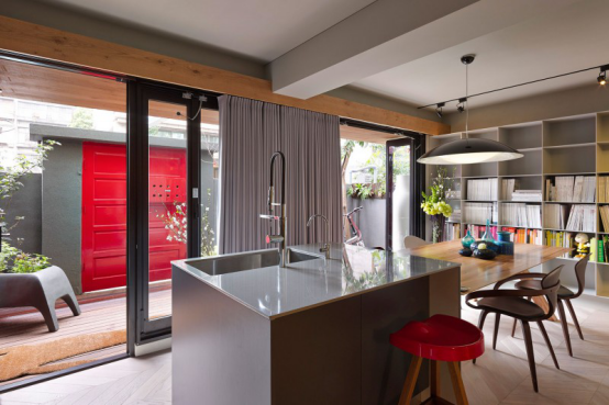 藍(lán)色花瓶、紅色座椅、淺灰色的吊燈也讓家變得跳動(dòng)起來了。