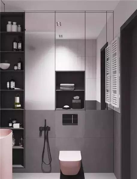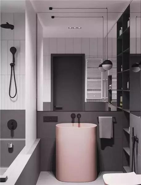 衛(wèi)生間回到了經(jīng)典黑白灰基調(diào)中,加入稍許粉色點綴。半墻的鏡子讓小空間看上去更大,也能作為穿衣鏡、化妝鏡使用。
