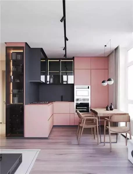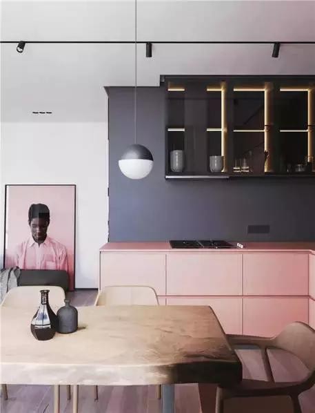 廚房是粉色與黑灰色為主色調(diào),吊柜內(nèi)加入燈帶設(shè)計,再用黑色的射燈來渲染氛圍,展現(xiàn)出一個時尚脫俗的廚房空間,讓人忍不住想多逗留幾分。