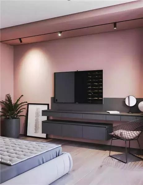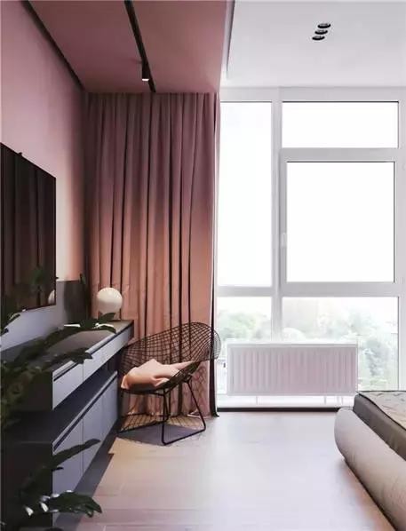 相比床頭剛性的風(fēng)格,床尾的墻壁刷成了粉色。