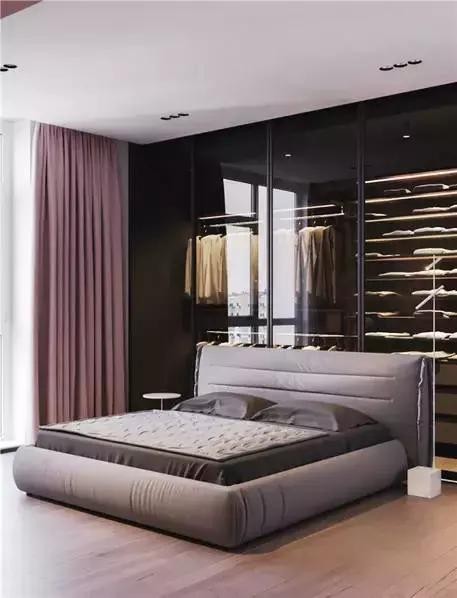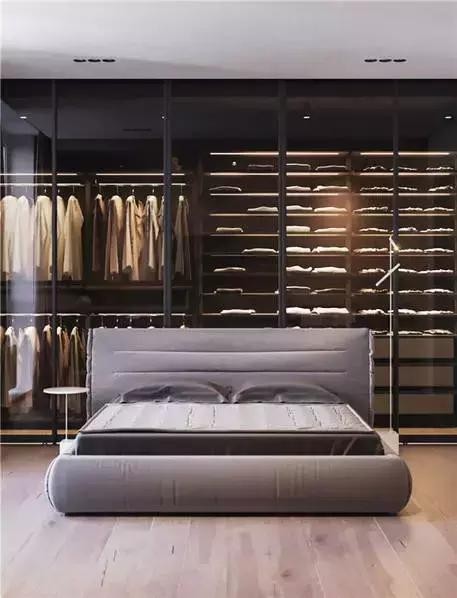 主臥內(nèi)有一個玻璃墻構(gòu)造而成的衣帽間。