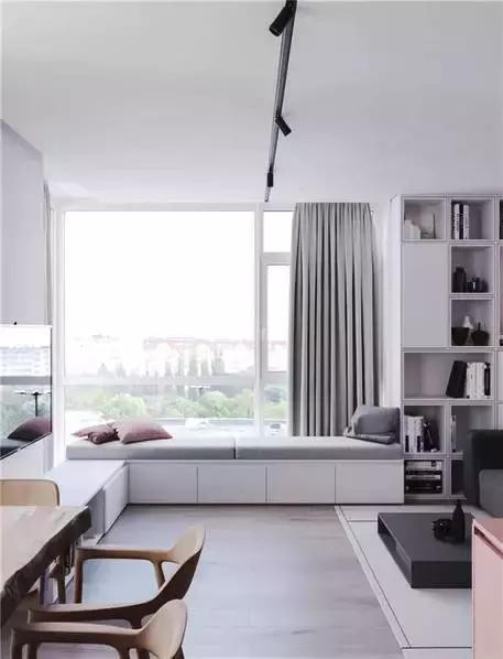 客廳電視柜延伸到了窗臺位置,成了“L”型,再加上坐墊,就成了一排休閑座位。是或躺或臥,閱讀小憩的最佳空間。