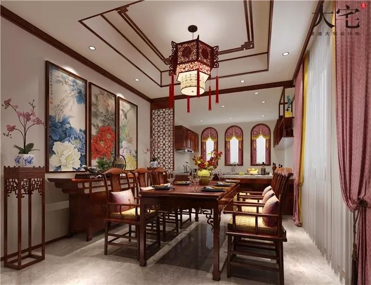 大面積的焦糖色線條充斥著整個空間,使整個空間有格調(diào)又不顯壓抑。淡粉色的窗簾,配以木質(zhì)的家具、吊燈,增強空間的自然感。深色木質(zhì)線條吊頂,盡顯中式風格。