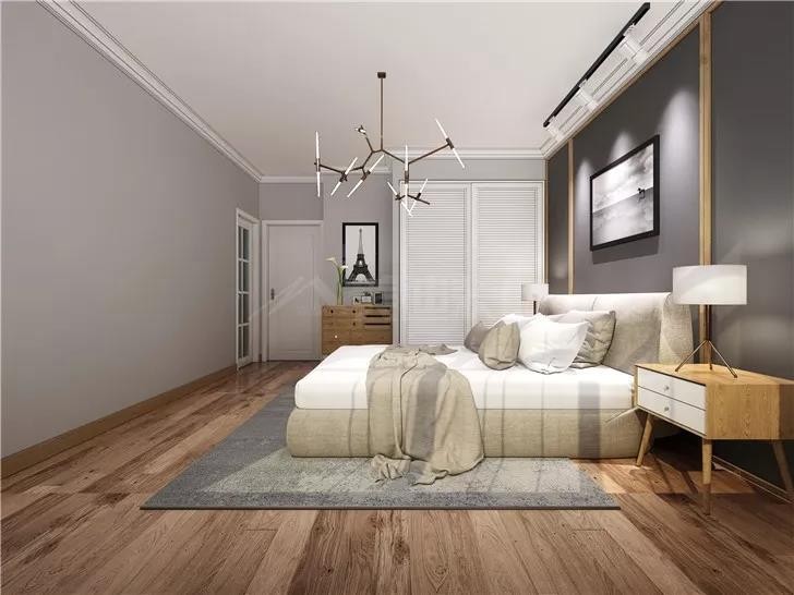 原木的地板讓整個室內(nèi)空間非常溫馨,而灰色的大面積墻面和白色家具則會讓整個房間的明亮度再上一個等級,配以黑色邊框的風景畫或造型燈,讓整個空間的色彩相協(xié)調(diào),看起來非常舒服。