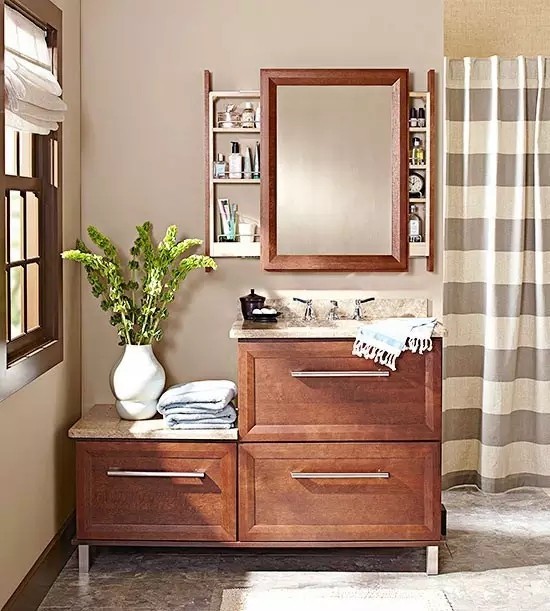 如果你家里安裝的是收納柜式鏡面,就最好不過了,既能當(dāng)鏡子用,又多了隱形的收納空間。