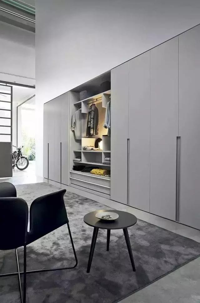這種按壓式我把手柜子,多數(shù)以白色、灰色、黑色為主。高至墻頂?shù)墓褡涌雌饋?lái)更像一個(gè)裝飾,不僅不會(huì)起到擁擠空間的感覺(jué),反倒與同色系墻面的顏色一致,起到了擴(kuò)寬視野的感覺(jué)。