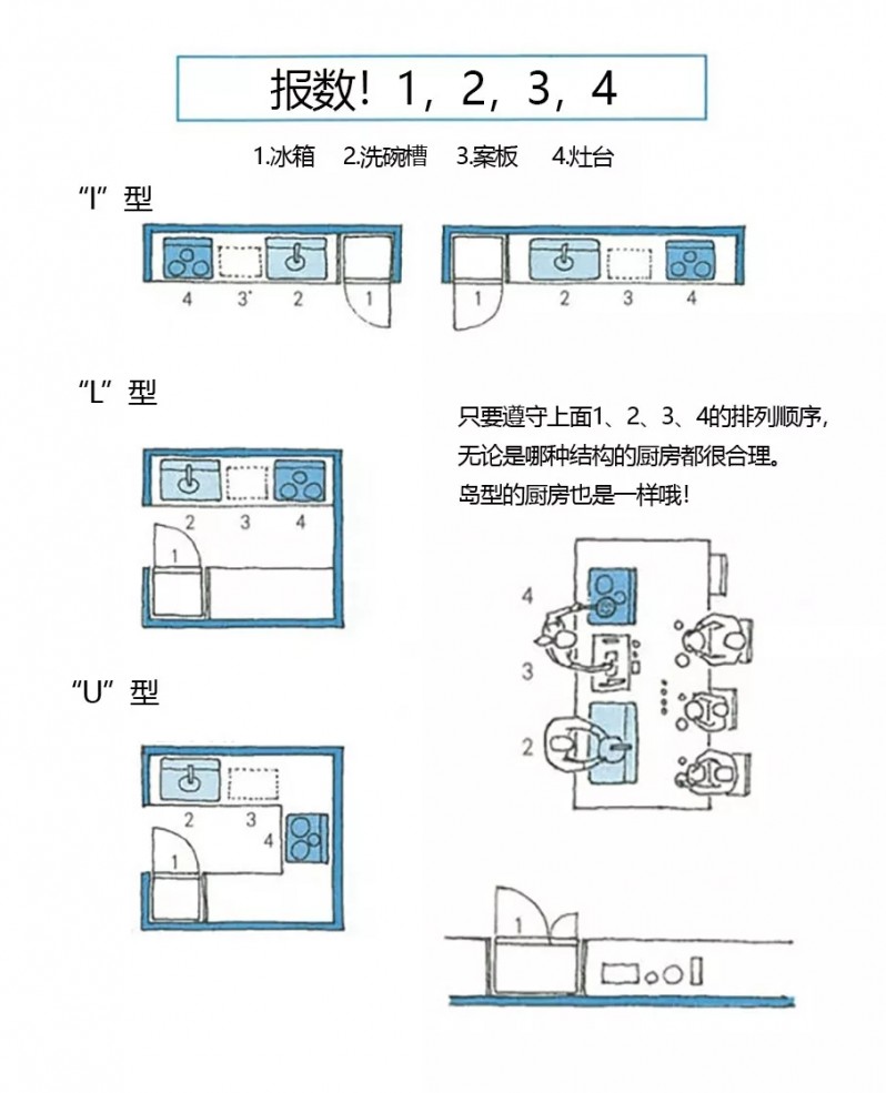 1、根據(jù)「下廚行動線」劃分不同功能區(qū),行動線:冰箱拿食材-洗菜-切菜-烹調(diào),不管什么結(jié)構(gòu),動線都是1-2-3-4, “I”“L”"U”型廚房的設(shè)置如下: