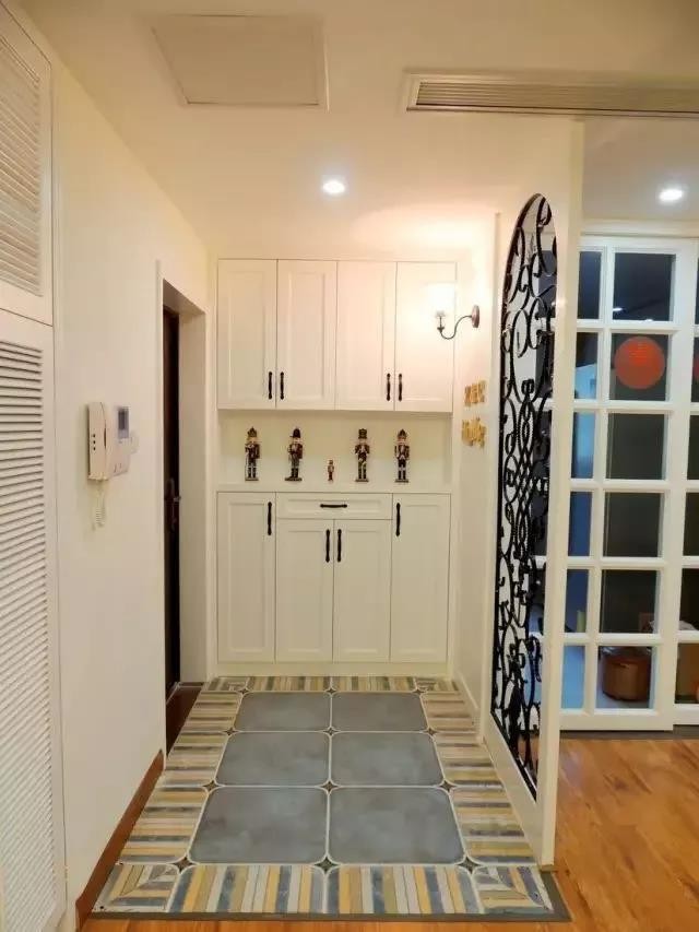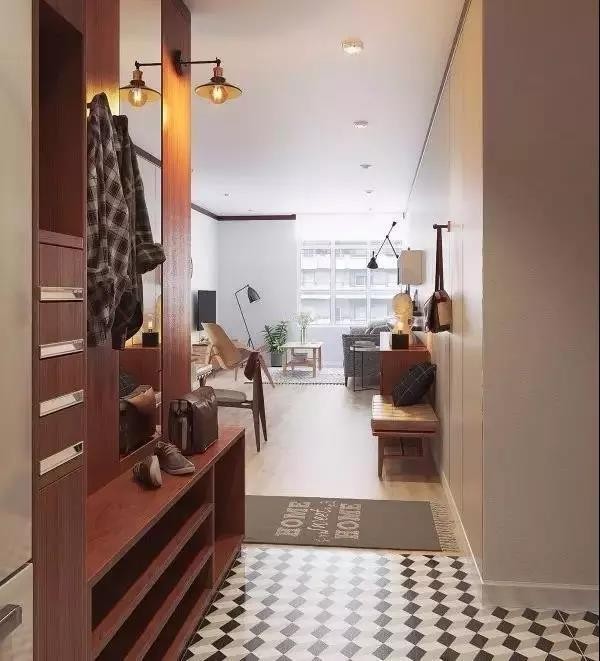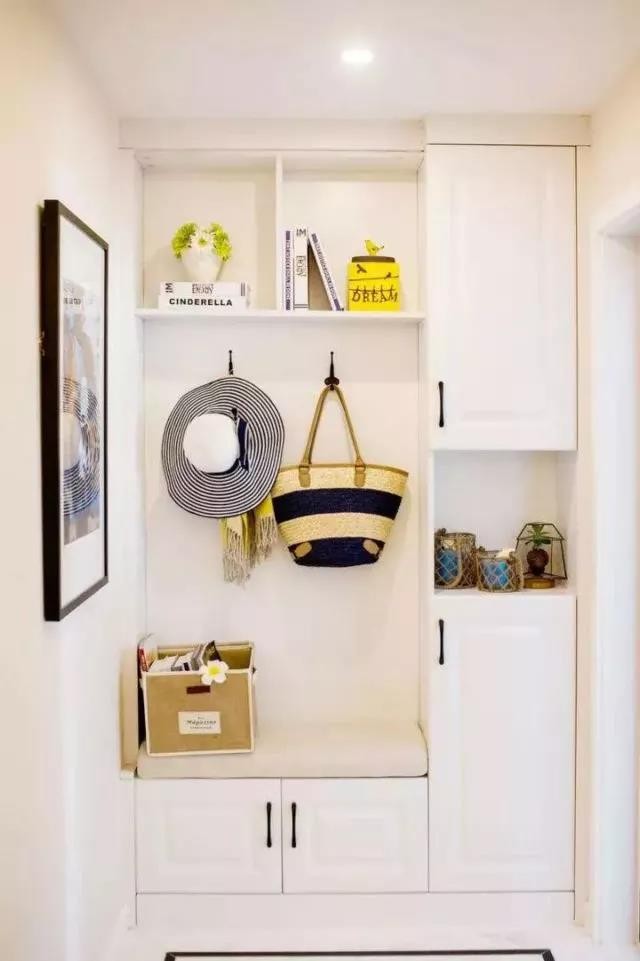 小戶型玄關(guān)的地面可以擺放兼具鞋柜和儲物柜功能的換鞋凳,不僅可以滿足每次坐著換鞋的需求,還能充當(dāng)臨時存放快遞的柜子呢,根據(jù)家里實際戶型大小在某寶定制即可。