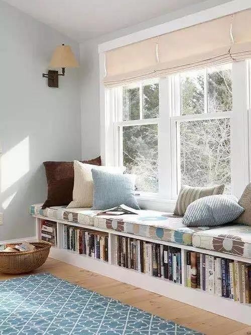 這是小置最喜歡的一種形式了,在飄窗上放置幾個(gè)靠墊和抱枕,手捧著書,低頭賞詩,抬頭即遠(yuǎn)方,美乎妙哉。