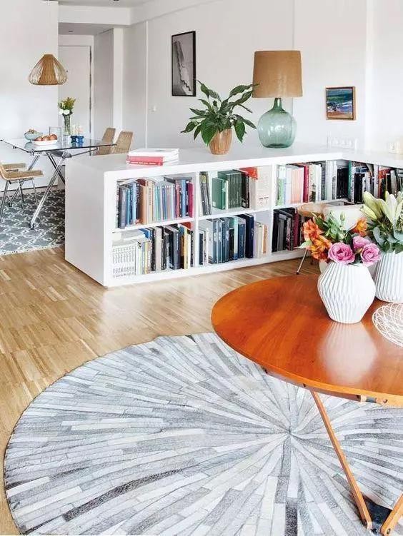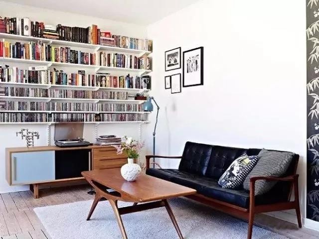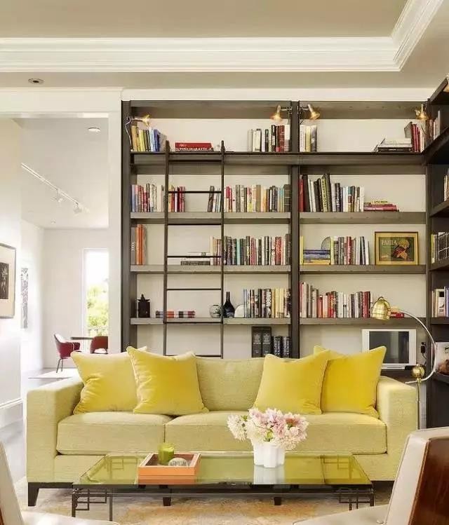 沙發(fā)不一定就要靠墻擺放,把它前移10CM,背景墻就可以變成整面的大書柜啦。